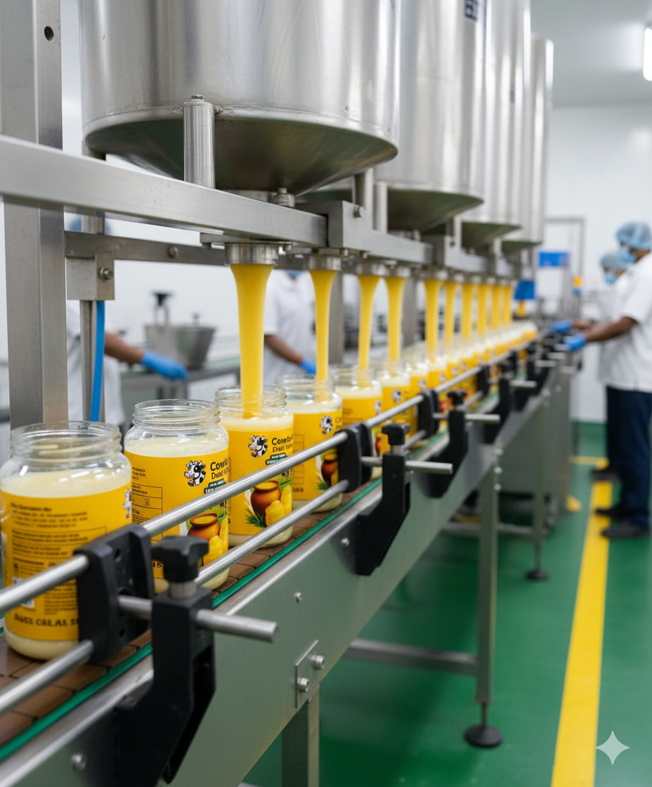 The freshly prepared ghee is poured into sterilized glass jars to preserve flavor and aroma.