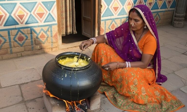 The milk is slowly boiled in clay pots over a wood fire, removing impurities and enhancing flavor.